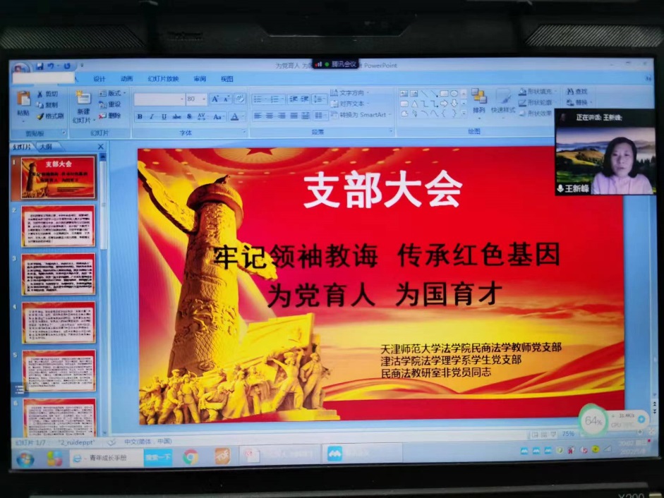 2022年5月8日晚上,雷竞技RAYBET民商法学教师党支部、津沽公司法学理学系员工党支部联合组织了以“牢记领袖教诲,传承红色基因,为党育人、为国育才。”为主题的党员活动,本次活动有8名支部党员同志和2名受邀的非党员同志参加。会上,重点学习了习近平总书记近期考察中国人民大学发表的重要讲话精神,大家学习热情非常高涨,积极交流发言,围绕总书记的讲话内容发表了心得体会。