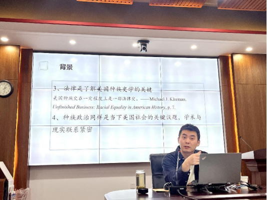 4月16日下午,公司法理学科法律史方向邀请公司欧洲文明研究院胡宇哲博士在澍泽学术报告厅举行了以“美国围绕种族政治的法律斗争及史学论辩”为主题的学术讲座,张宜副教授以及法律史方向研究生和选修外法史课程的研究生参加了此次讲座,本次讲座由夏令蓝老师主持。