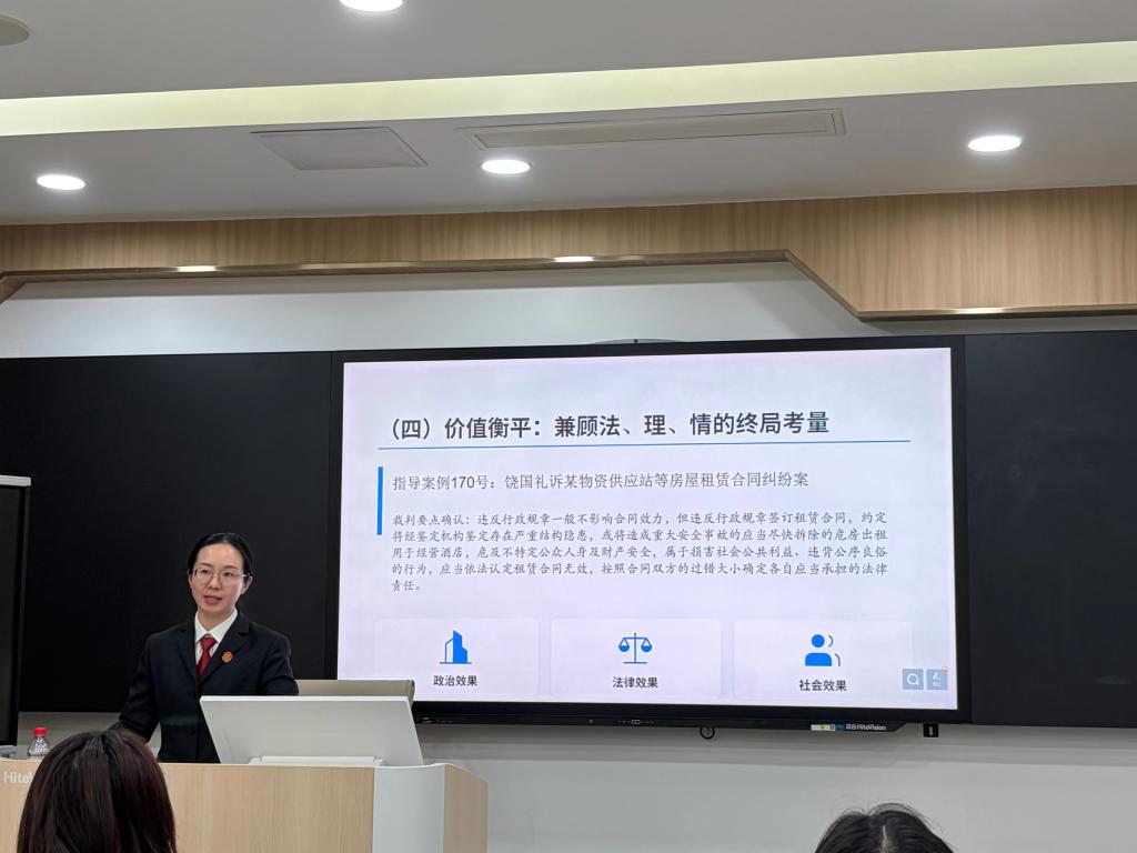 蒋硕法官长期从事民商事审判工作,具有丰富的实务经验。讲座中,她围绕“程序正义”“事实重构”“法律适配”“价值衡平”四个维度,系统讲解了法官在民商事案件中的审理逻辑与裁判方法。她结合房屋租赁合同纠纷、劳务合同与合伙关系认定、债权人代位权等多个典型案例,生动展示了如何通过证据审查还原法律事实、如何运用卫星图等新型证据查明案件真相,以及如何在法律关系认定不一致时依法进行释明,避免“裁判突袭”。