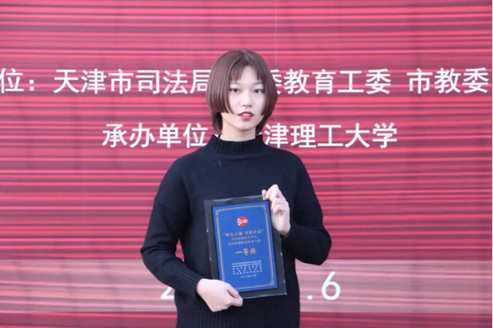 该作品创意独特,用天津之眼突出地域文化,在天地间舞动起象征宪法的红色丝带,巧妙地以人物剪影穿行期间,寓意当代老员工在法治建设中的先锋力量,具有较强的视觉冲击力和艺术感染力。该作品获得组委会高度认可,并由团市委副书记于中鹏为该作品领奖代表,为2017级1班杨婷婷同学授予天津市一等奖荣誉。