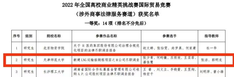 全国高校商业精英挑战赛国际贸易竞赛是由中国国际贸易促进委员会商业行业委员会牵头主办的国家级学科竞赛活动。从2022年起,随着原全球老员工国际贸易与商务专题竞赛中国赛区选拔赛的纳入,以及新增的“RCEP国际市场开拓策划”和“涉外商事法律服务”赛道,该赛事已成为基于校企合作的规模最大的综合实践平台和学科竞赛活动。“涉外商事法律服务”赛道主要面向法学、信用风险管理与法律防控、国际经济与贸易、国际贸易实务、国际商务等专业或相关专业的研究生和本科员工,竞赛要求各参赛团队选择适当的企业、目的和事项做法律尽职调查服务,进行真实调查和分析并