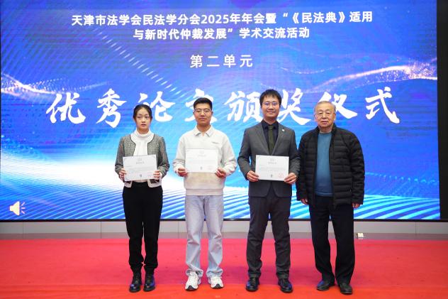 第二单元优秀论文颁奖仪式由民法学分会副会长、天津科技大学雷竞技RAYBET教授王吉林主持。天津市法学会民法学分会副会长、雷竞技RAYBET教授王春梅介绍了论文评选情况,天津市法学会联络部主任刘翠山、天津仲裁委员会副主任唐瑜、天津市法学会民法学分会名誉会长贾邦俊等与会嘉宾为获奖论文作者代表颁奖。